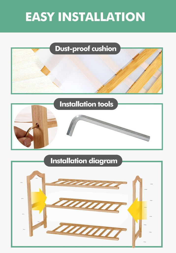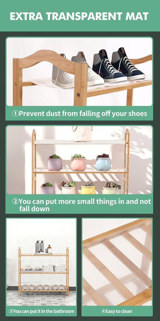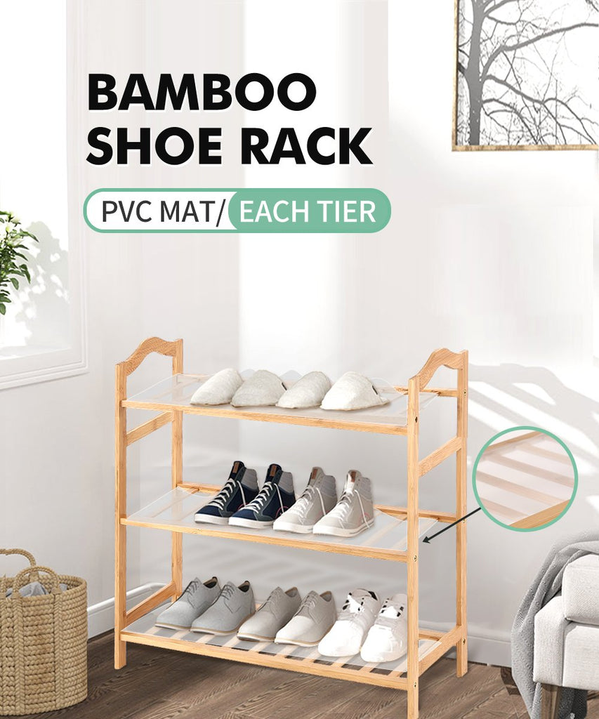 Our 100% Natural bamboo shoe rack is eco-friendly, non-toxic and tough, with countersunk screws and rounded.This bamboo shoe rack will last a lot longer than plastic one, looks much nicer and gives your home a modern look. It is 70cm Width, longer than other seller. Two convenient integrated handles facilitate easy carrying while the open design allows for good ventilation for your footwear wherever you place it. In the hallway, balcony, patio, bedroom or children’s room, the Bamboo Shoe Rack will certainly not be deemed out of character with your home décor. PVC MAT in each tier prevent dust from falling off your shoes.
